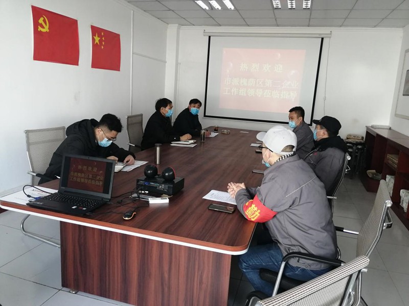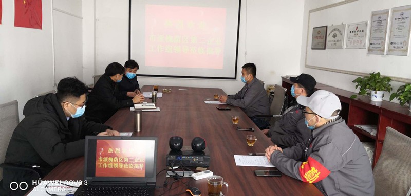 3月10日上午,以槐蔭區政協副主席、區工商聯(民間商會)主席(會長)李宗孝為組長,槐蔭區委第三巡查組副組長蘇強、槐蔭區工業和信息化局四級調研員惠健等領導同志為組員的市派槐蔭區第二企業工作組進駐公司,考察指導公司疫情防控工作和復工復產工作。公司總經理、疫情防控小組組長徐鵬,黨支部書記、生產副總、疫情防控小組副組長孔祥健,董事會秘書、辦公室主任、疫情防控小組辦公室主任王德華等公司領導熱情接待了工作組一行。